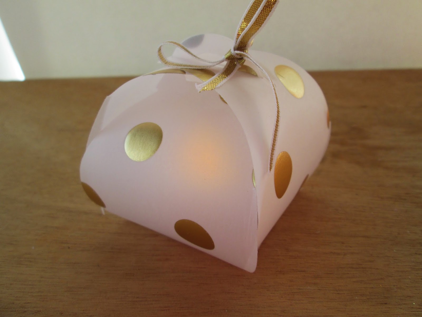 I apologize that I had to take this picture in a slightly darker room so that you could see the effect the candle gives to the curvy box. I also took a picture of it in the light. I used the vellum that has the gold dots on it. Tied a gold ribbon on the top. I think I should add a tag. There are 3 tag shapes to go with the curvy box framelit in the kit. So you can add that very easily. Who needs to order this? I am placing an order tonight. So let me know by 6pm and I will get it ordered.